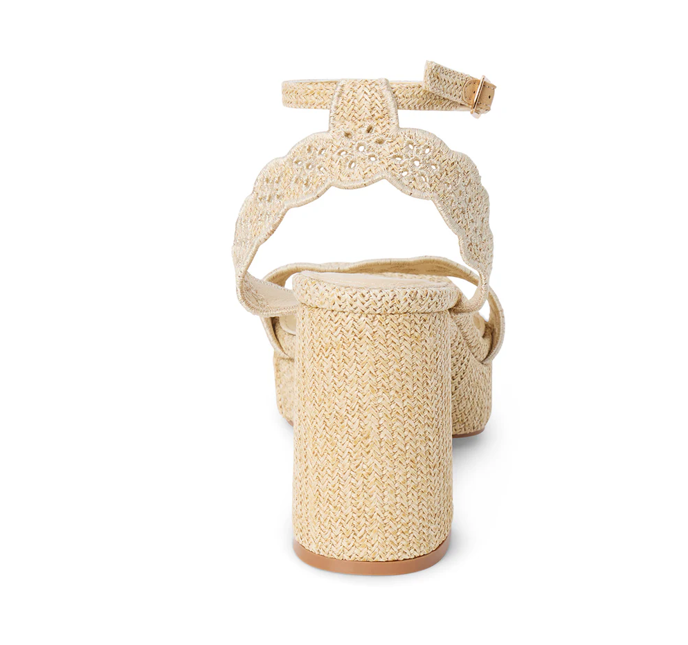A standout neutral with elevated texture, the Maiden Platform Heel brings a fresh, feminine touch to any look. Designed with a woven raffia-style finish and delicate scalloped detailing, this platform heel blends classic charm with a statement silhouette. The chunky heel and platform base add height while keeping it comfortable for all-day wear, and the ankle strap with buckle closure ensures a secure fit.